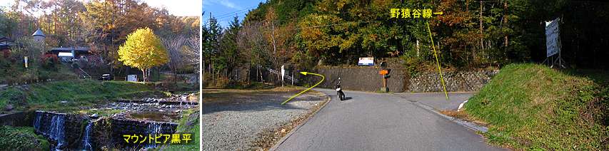 | 御岳線の起点から約8.1キロ地点まで進むと甲府市営のマウントピア黒平へと至り、更に約8.3キロ地点では野猿谷線が右へと分岐しています。前記したように野猿谷線が出きるまでは御岳線が黒平町への唯一の道でしたが、現在は野猿谷線を進むと約3.6キロで野猿谷線の起点へと至り、約4.6キロ地点で荒川ダムの荒川大橋へと抜けていきます。野猿谷の底を縫っていくため眺望的なものはありませんが、昇仙峡方面へ抜けるのであれば御岳線を使うより遙かに短時間で抜けられます。 |