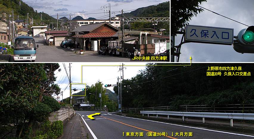 | 林道柿の木線と林道千足線は上野原市川合の千足地区から延びている短いピストン林道です。今回は二つの林道が殆ど同じような場所にあり、また、それぞれの林道が別個で扱うほど長くないので同一ページで扱っていきたいと思います。さて甲府市方面から両林道へ行くには、まずは国道20号を東進して上野原市四方津(しおつ)にあるJR中央線の四方津駅(写真上左)を目指します。四方津駅からは更に約1.0キロほど進んでいくと久保入口交差点(写真下)があるので、同交差点を右折して久保地区へと進みます。同交差点には信号機の横に「久保入口」という交差点名の看板(写真上右)が出ているので直ぐに分かると思います。 現在地マップ 元の写真に戻す |