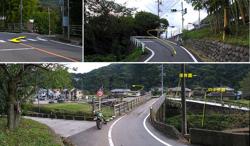 | 久保入口交差点(写真上左)を右折した道(写真上右)は下り坂となり南東へと向かいます。約100mも進むとJR中央線の上に架かる橋(写真下)となるので渡って左へと曲がります。ちなみに橋を渡った同地点はT字路になっていますが、右は市営の「巌」保育所で行き止まりです。必然的に左へと曲がっていくことになるので道を間違えることはないと思います。 |
