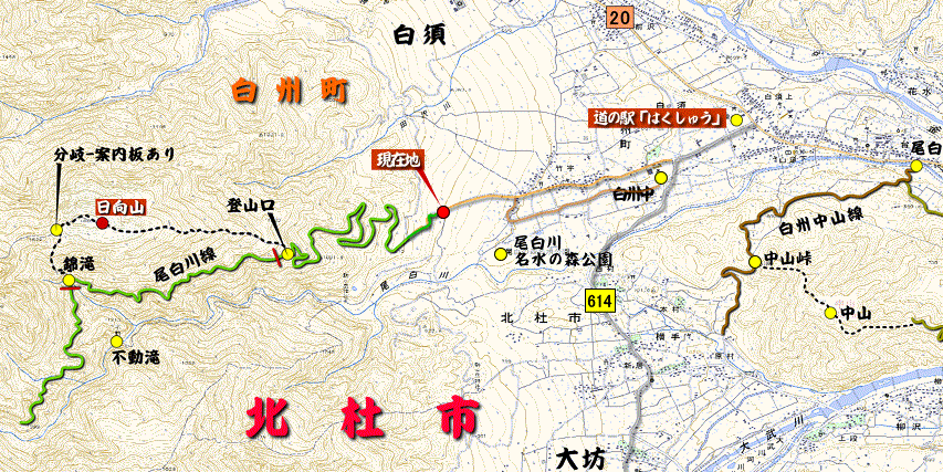 | 甲府市方面から日向山へ行くには国道20号を長野県方面へと進み、まずは北杜市白州町を目指します。北杜市白州町まで行くと白須地区に「白州中学東」交差点があるので左折して県道614号へと入ります。 交差点の拡大 |