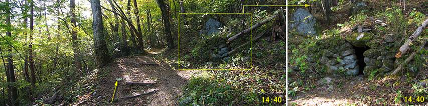 | 登り始めて約4分。登山道の直ぐ右側に石窟がありましたが、これはなんなんでしょうね。炭焼きの跡?それとも石器時代の居住地?なんてことを考えてしまいましたけど結局よく分かりませんでした。 |