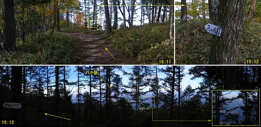 | こちらは右手となる八ヶ岳方向(写真上左)の景色。ほぼ稜線に沿った道なので、この辺りまで登ってくると、右手と左手の景色が時おり交互に顔を覗かせます。そして登り始めて約59分。前方の木に標識が見えて「10−5」へ到着です。 |