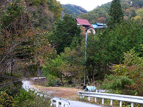 午後2時41分 県道7号から約6分。 前方に高成町の集落が見えてきました。 高成町の戸数は23戸で人口は49人。 先ほどの竹日向町が11戸19人なので、それよりは大きな集落です。 |
