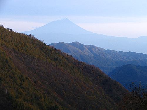 午後3時5分 荷坂峠からの景色は良くありませんが、下るに従い、南アルプスの山々、太刀岡山、茅ヶ岳、金ヶ岳、黒富士、といった山々を見晴らし、足もとには荒川ダムの能泉湖が広がります。 |