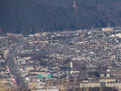 午後2時42分 ちょっと一息。 北側の正面には御正体山1682m、鹿留山1632m、杓子山1597m、そしてこれから行くことになる高座山1304mといった山々が連なり、その下には忍野村や富士吉田市の国道139号といった景色が広がります。 |
