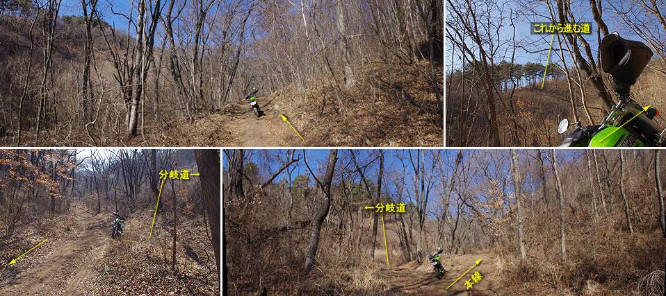 | 入り口から約1.0キロ地点(写真上左)まで進むと左へと鋭角的に切り返します。同地点は入り口から寄り添ってきた沢の最上部にあたり、沢の上部を廻った道は約10mほど先で変形のY字路(写真上右と写真下)へと行き着きます。本線は右直進的に進みますが、左の道へ下ると先ほどの約600m地点と約800m地点の場所へと戻ります。ただ途中は完全な草道となっており、当日の枯れ草の量からして夏場などでは前が見えないほど生い茂っていると思われます。本線と沢を挟んだだけの道であり、特に面白いような道でもないので入らない方が無難かもしれません。 現在地マップ 元の写真に戻す |