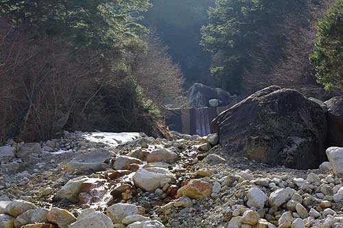 昔はもう少し先まで行けたそうですが、現在は巨大な岩がゴロゴロと転がっており河原の手前までしか行けません。 沢は正面の小高い山を挟んだ場所で分岐しており、右側の沢の上流には大きな谷止めダムが築かれています。 |