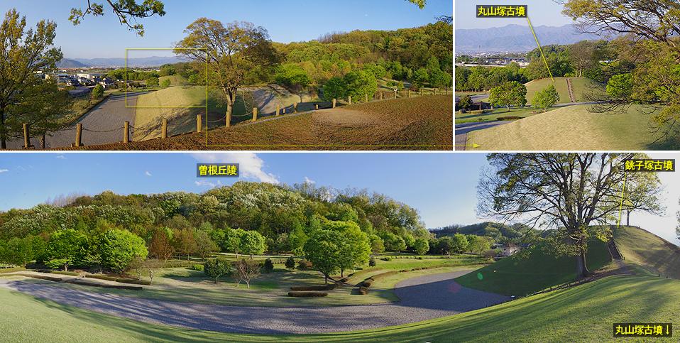 | 銚子塚古墳の北東側に視線を向けると丸山塚古墳を望みます。銚子塚古墳よりはやや小さいもののその大きさは直径が72mで高さが11m。山梨県では最大の円墳だそうです。 写真上右の 丸山塚古墳を拡大 |