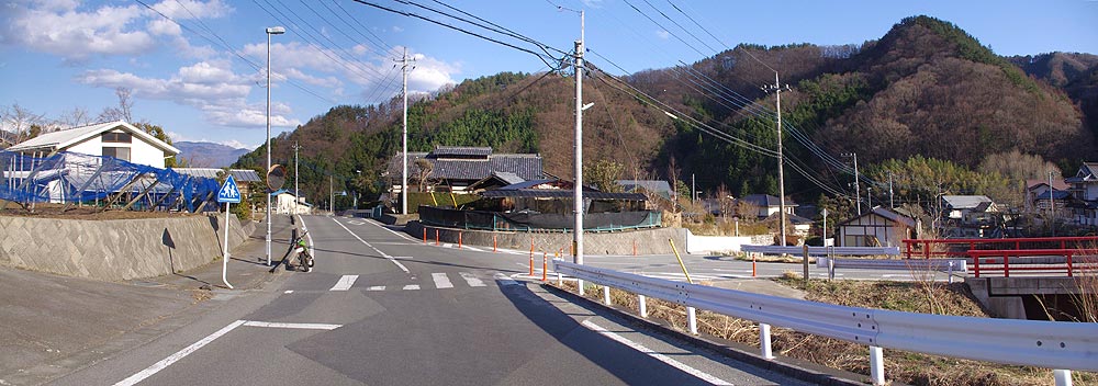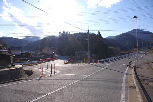 | 午後5時13分 野背坂峠を下って市川地区へと下りてきました。 突き当たりの道はフルーツラインで、右へ曲がって笛吹川フルーツ公園へ向かいます。 |