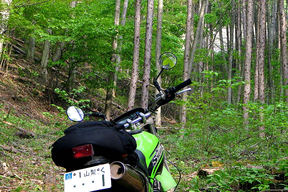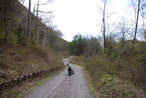 | 逆側から見るとこんな感じ。 道というよりもまるっきりの山林の中で、勾配も後輪が空回りするくらい大きいです。 |