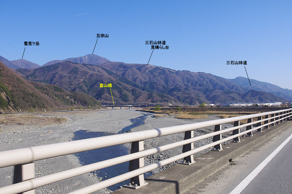 | 早川に架かる新早川橋を渡ります。下流には国道300号の富山橋が架かっており、その上には三石山林道の道筋を長く望みます。 | |||||