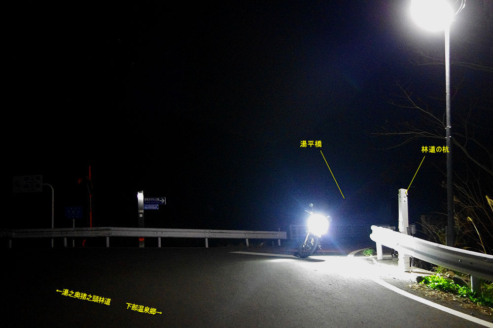 | 竹の沢踏み切りから約46.0キロ(佐野峠までの往復含む)。 三石山林道の終点(実際はこちら側が起点)へ到着。 下部川に架かる湯平橋を渡ると直ぐに県道415号となって道の左側に三石山林道の杭が建っています。 同地点を左へ曲がると下部温泉郷、左へ曲がると約2キロ先で湯之奥猪之頭林道となって最終的には静岡県へと抜けていきます。 |