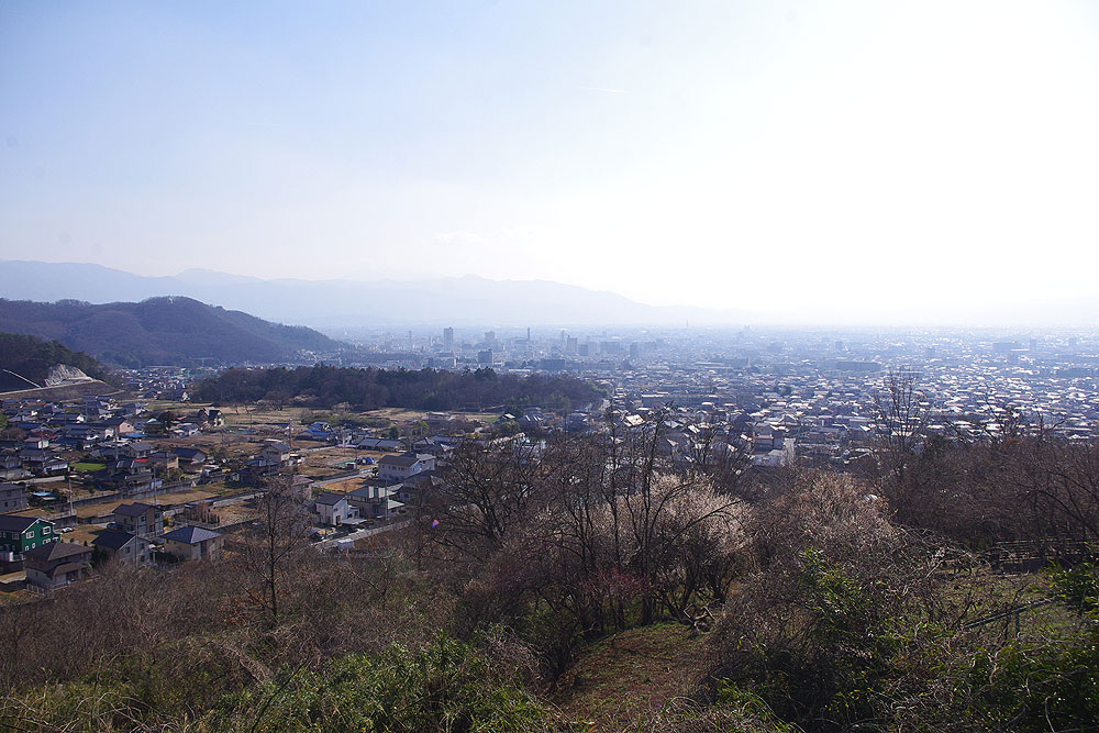 | こちらは東側の景色。肉眼ではパノラマとなって広がる甲府市や南アルプス市の街並み、更には南アルプスの山々などを見ることが出来たのですが、残念ながら写真だとカスミと逆光で写りませんでした。 | |