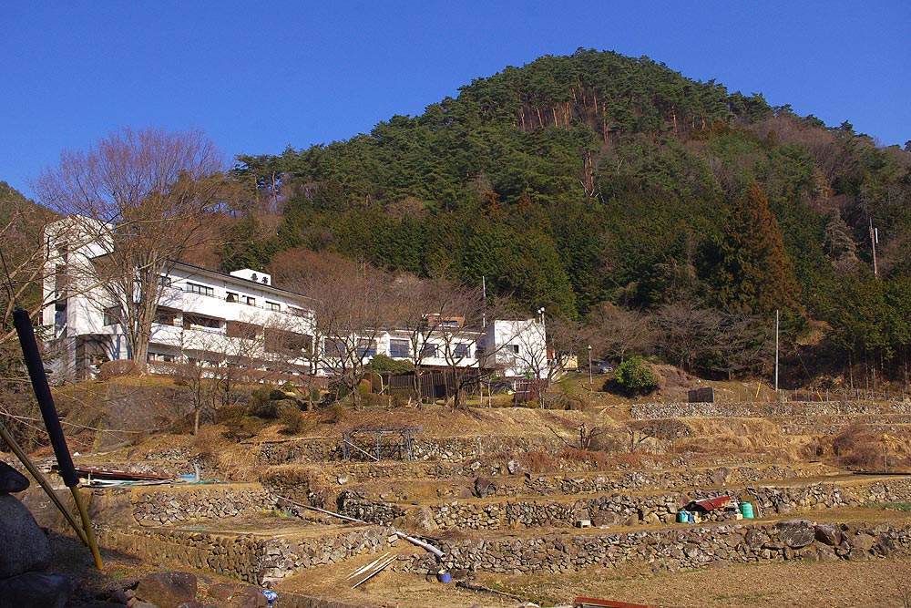 | 午後2時54分 要害温泉と背後の要害山。春になると桜が綺麗です。 |
