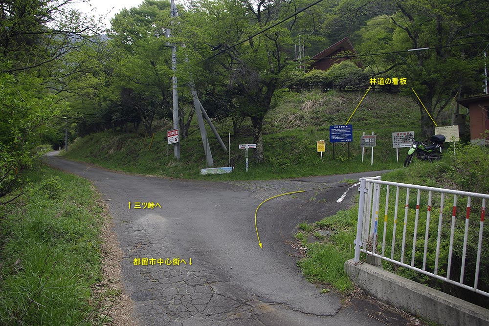 | 同地点には新旧の林道の看板が立っており簡単な周辺案内板も置かれています。今回は左折しますが、右折側は暫く舗装路が続いたあと登山道となり清八峠方面や三ツ峠方面へと至ります。 | ||