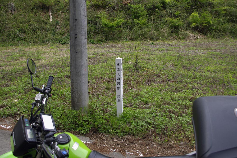 入道沢林道までの道順は少々判りずらいと思いますが、ナビやスマホを持っている方は「サンエス潤滑株式会社」で検索して行けば、その約50mほど先に入道沢林道の杭が建っています。