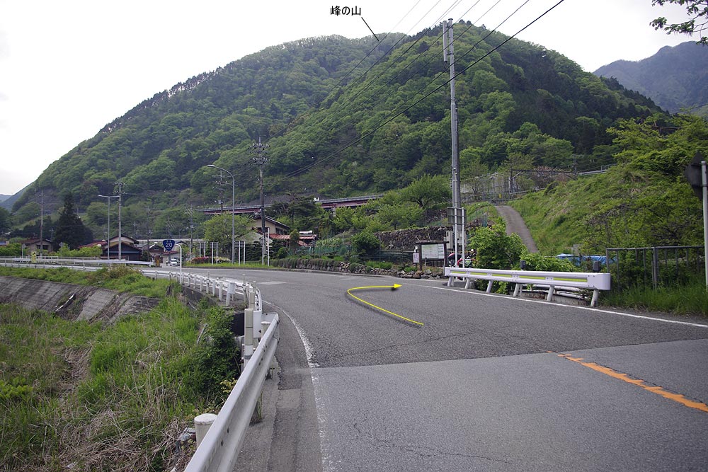 | 初狩小学校東交差点で左折して約2.4キロ。目的地とする大鹿林道の入り口が見えてきました。ちなみに正面に見える山は峰の山911.2m。大鹿林道はこの峰の山をグルリと1周する林道です。 | ||