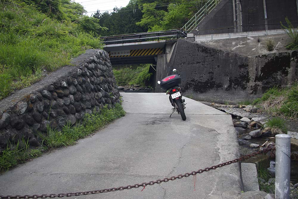 | チエーンの奥に進むと滝子川に沿って進んでいき、約50mほど先でJR中央線の橋梁下を潜ります。 |