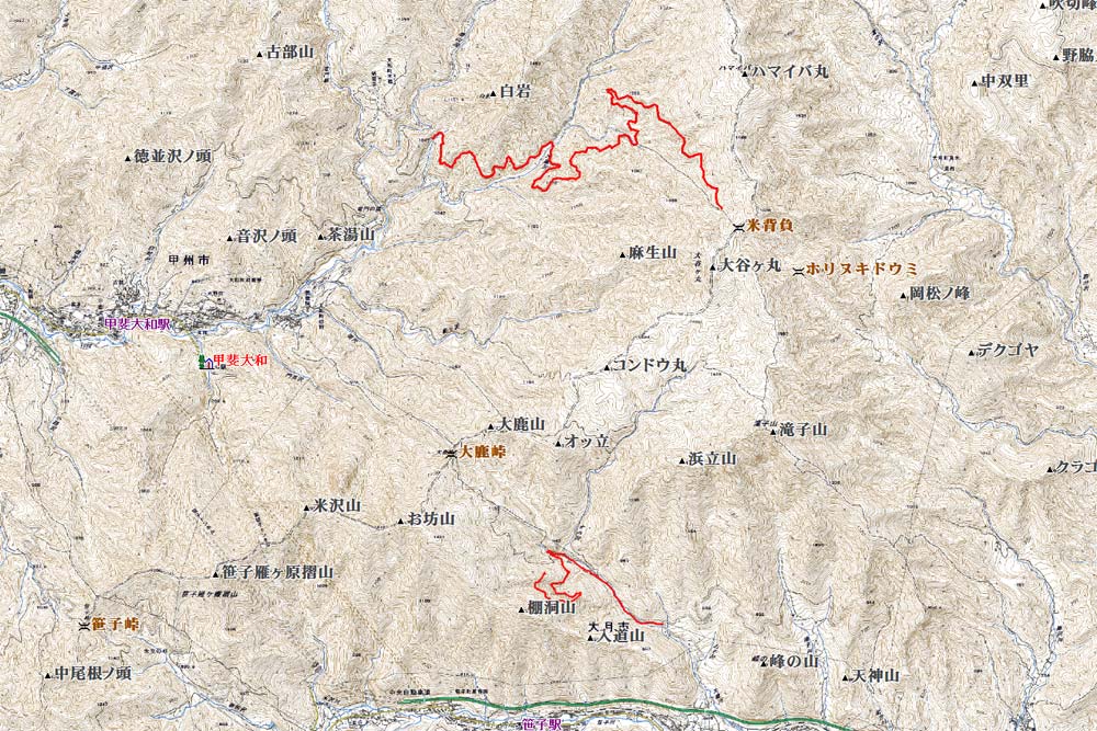 | ちなみに大鹿峠というのは大鹿山とお坊山の中間に位置する1125mの峠です。将来的な大蔵沢大鹿林道は大鹿峠の手前で東へと進路を変え、オッ立を南から回りこんだあと北へと向かい大谷ケ丸1643.8mへ抜けさせるようです。 |
