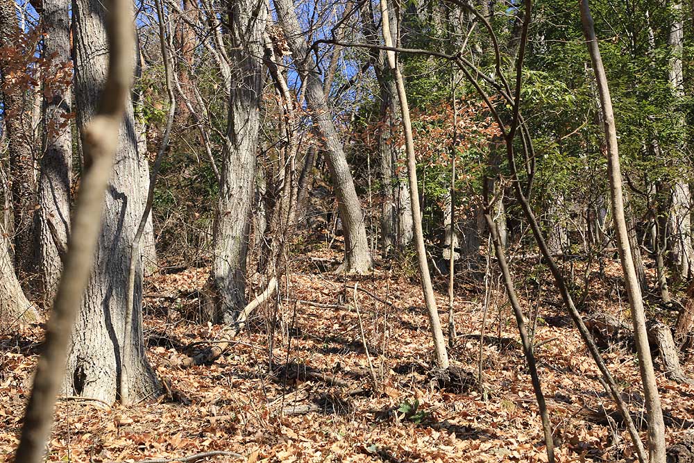 | 15時50分 さてここからどうするか。 というのも当日の目的地は鹿穴ではなく、もうひとつ北側に位置する鬼山。距離的には400mくらいしか離れていないのだが、自身の貧脚では往復すると40分から50分くらい掛かってしまいそうだ。当日の日没は17時3分。山だと暗くなるのはもっと早い。いま直ぐに引き返しても途中で暗くなるのは必定だ。残念だが鬼山まで行くことは断念することにした。 |