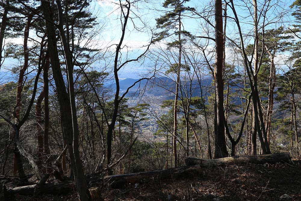 | 13時22分 約35分ほど登って後方を振り返ってみた。 樹林を透かして盆地を僅かに望み、左手には愛宕山やその山腹を縫っていく愛宕山スカイラインを見て取れる。 |