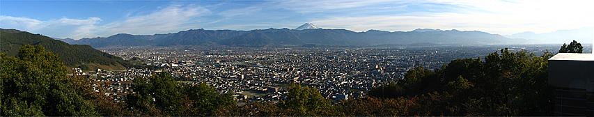 | この施設は大笠山に建つ少年自然の家で、その屋上はちょっとした展望台になっています。ここからの眺望としてはほぼ正面に城東町や朝気町を見下ろし、左側に山梨学院大学の酒折町。右手には県立科学館の屋根が少しだけ見えています。 |