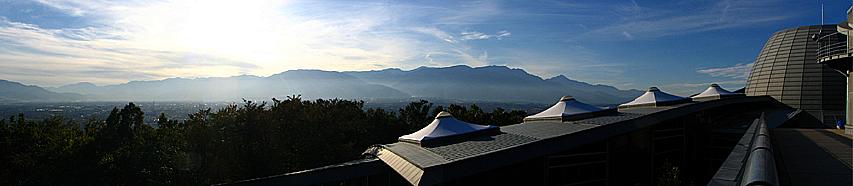 | 天体観測用ドームの奥が展望台となっています。ここからの景色は素晴らしく、正面に富士山、西には春日居町や石和町、東には南アルプス市方向の景色が広がります。県立科学館が建つ前は韮崎市方向まで一気に見渡せたのですが、現在は立ち位置を変えたり、天体観測ドームへ登らないと見られなくなってしまったのがちょっと残念なところです。 |