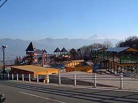 富士屋ホテルの上には土産物屋があり、そのテラスには双眼鏡が設置されています(写真左)。また、道に沿っていくと「エコサーキット(写真中央)」や近ごろ人気となっている「ほったらかし温泉(写真右)」などもあります。森林浴や自然観測といった面では一歩劣りますが、施設に於いては山梨で一、二を誇る公園です。都市部に近いため休日には賑わいますが、低予算で家族が一日を過ごすには最適といえるでしょう。