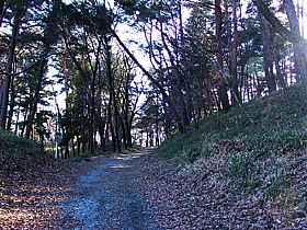 | 数分ほど登ると「西三の丸」となり、「東三の丸」と同様に土塁の跡が残っています。一帯は公園地帯になっているので樹木は適度に伐採されており、ここから西に目を移すと国道20号や韮崎の町並みが望めます。 | ||