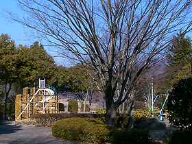 | 運動場の横には数種類の遊具が置かれた小さな広場があります。また南側へ廻ると甲府盆地を望めるポイントや金桜神社の鳥居があります。かつてこの鳥居は金桜神社へと続く御岳道にあったそうですが、新道ができると参道が使われなくなり、江戸時代後期には既に倒伏していたそうです。それを昭和59年、田圃より掘り起こし現地点に移設したそうです。 | |||