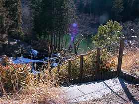 | 伊奈ヶ湖は櫛形町にある小さな湖です。伊奈ヶ湖は南伊奈ヶ湖と北伊奈ヶ湖があり、南伊奈ヶ湖は県道108号沿いにあるので分かりやすいのですが、北伊奈ヶ湖は幹線道路から外れているため見落とされがちです。周囲には県民の森や菖蒲池園地があり、それぞれ散策が出来るようになっています。上の写真は南伊奈ヶ湖で、湖畔には遊歩道が整備されているので周回することが出来ます。途中には階段があり(写真右)、菖蒲池へと降りていくことが出来ます(徒歩で約1分)。ここをクリックすると周辺の案内板を開きます(約99k)。 |