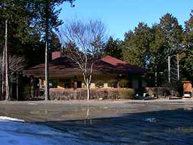 | 県民の森は南伊奈ヶ湖から北へ約200mほどの場所にあり、看板があるので直ぐに分かります。入っていくと広い駐車場となっていて、正面に森林科学館(写真左)、北側にレストハウス伊奈ヶ湖(写真中央)、道を挟んだ南側にウッドヴィレッジ伊奈ヶ湖(写真右)が建っています。 |