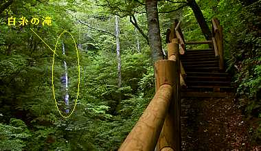展望所が見え始めると、2つ目の橋(写真左)までは僅かです。橋の先の正面には「白糸の滝」の看板(写真右)があり、その上には展望所が建っています。
