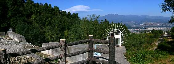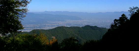 | 分岐点から四阿までの距離は50mといったところでしょうか。一見すると四阿で行き止まりのようにも見えますが道は更に続いており、四阿の横を抜けて10mも進むと正面に甲府盆地の大パノラマが広がります。ここからの景色は非常に爽快です。僅かな時間ですので労を惜しまず行ってみることをお勧めします。なお同地点には三角点が立っており標高は1671.5mと表示されています。 | |||