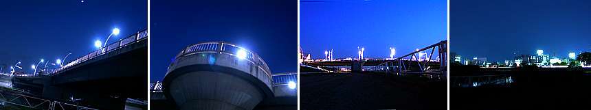 | 千秋橋には上りと下り各2つずつのテラスが付いています。千秋橋の他にテラス付きの橋は千塚町の千松(せんまつ)橋もありますが、夜になると煌々とした外灯が輝き荒川サイクリングロードに架かる夜間の橋では最も綺麗だと思います。 |