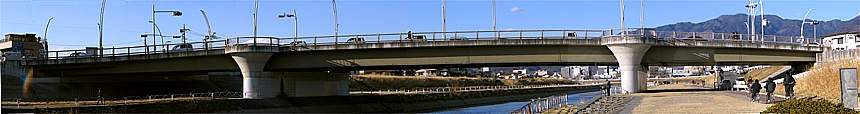 | 遠目には冴えない橋ですが、彩火橋は県内の動脈路である甲府バイパス(国道20号)の一部です。荒川サイクリングロード上に架かる橋では最も大きな橋ではないでしょうか。彩火橋は右手(東側)の中小河原町と左手の上小河原町を結び、橋上に出ると甲府バイパスを行き交う車が途切れることなく往来しています。 |