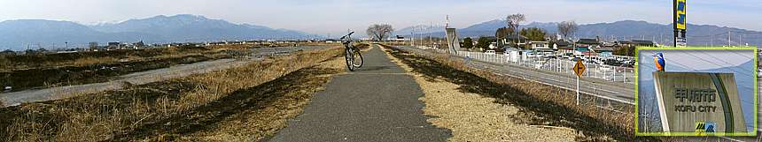 | 空き地の西側には荒川を挟んでアイメッセ(写真左)があり北西側には八ヶ岳(写真中央)を望みます。起点は空き地の約50mほど北にあり、ここにはサイクリングロードの看板が出ています。 |