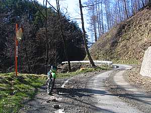 支線へ入ると直ぐに道幅1車線強の急勾配な上り坂となります。 |