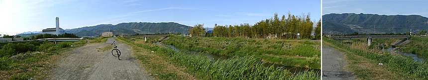 | 笛吹橋は国道411号となっているので、国道20号の石和橋と同様に走られた方も多いと思います。平行しているのは笛吹水菅橋。単なる水道管の橋なので当然この上は通れません。石和町は温泉街として有名ですが、左手へ進むと数多くの温泉旅館が建ち並びます。笛吹橋を潜っていくとやがて一般道へと繋がります。一見するとサイクリングロードはそこで途切れてしまうように見えますが、一般道の手前に右へと延びる細い道があるので右へと曲がります。 |
