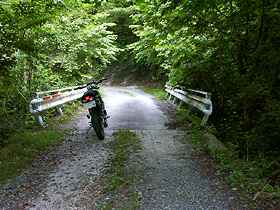 | 岩花橋までの道筋を簡単に書いておくと、道志村役場前の国道413号を同役場から約1.3キロほど西進していくと「道志の湯」へと至る道があるので左折する。国道413号を左折して約1.1キロほど進むと「道志の湯」となり、更にそこから約700mほど進むと室久保川にかかる岩花橋(写真左)となるので左折する。岩花橋までは一般道の広い道路だが、岩花橋を渡ると本格的な山道となり山腹へと上っていく。岩花橋から約700mほど進むと舗装が切れてダート路へと変わる。 | ||||||||||||||