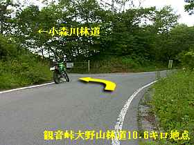 | 奥山林道へと左折すると直ぐに小森川に架かる小さな橋があり、林道の杭はその橋を渡った直後の左側に立っている(写真左)。橋を渡ると小森川左岸の道となり、林道の杭から先は右へ折れるようにして緩い坂道を上っていく。暫くは小森川林道と平行に走り、右下に小森川の流れを見ながら進んでいくが、やがて小森川林道からも離れていく。 | ||||||||||||||