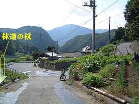 | Y字路を右に曲がっていくと約1.2キロ(塩川ダムのT字路からだと約2.2キロ)で左へと大きく曲がっていくカーブの先端で林道日向日影線が右へと延びている(写真左と写真中央)。林道の杭(写真右)は、その右へと入った10mくらい先の右側に立っている。 | ||||||||||||||