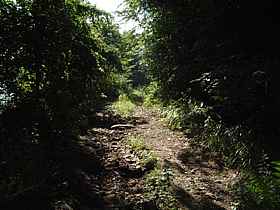 | 約3.9キロ地点からはやや勾配の大きい下り坂となり、路面には下草が長く延びている。また木々の張り出しが大きく、道幅は約1.5車線弱あっても枝葉を掻き分けるようにして進んでいく。バイクでも手で払いのけるように進んだので4輪では車体に当たるのは避けがたい。 | ||||||||||||||