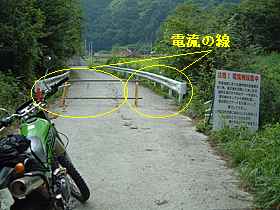 | なお林道の看板を約100mほど下っていくと鉄柵(写真左)が道を塞いでいる。鉄柵には電線が絡ませてあり電流が流れているので気を付けよう。この電線は取り外せるようになっており、横に説明書きの看板があるので注意して取り外そう(んー、前はなかったんですが・・・)。その先は鉄柵を約200m(林道の看板からだと約300m)ほど下っていくと町道へと突き当たる(写真中央と写真右)。町道に出る場所は林道日向日影線へ入った場所から約900mほど進んだ地点であり、左に曲がると塩川ダムへ約3.1キロ、右に曲がると増富の湯や通仙峡を横目に約5.0キロで観音峠大野山林道へと抜けていく。なお町道へと突き当たる場所には「比志・日影」という地区看板と「日影」バス停が立っており、逆から入る場合には同看板とバス停を目印にして行くといいだろう。 | ||||||||||||||