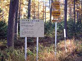 | 上の写真は逆側から見たパノラマ写真。右の端に立つ林道の杭は林道小武川線の杭で、小武川支線の林道の看板はその手前の分岐路を入った直ぐの場所に立っている(恩賜林の看板(林道の杭の上の看板)でちょっと隠れてしまった)。なお2003年11月現在、林道小武川線の舗装は林道御庵沢小武川線を分岐した場所から同地点まで延びている。 | ||||||||||||||
