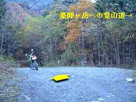 | 更に約100mほど進んだ約3.7キロ地点(写真左)まで進んでいくと道は再び分岐する。右に曲がると大昭和山林部という看板のかかった小屋があり、そこから先は薬師ヶ岳への登山道となっている(車輌不可)。同分岐路は直進していき、約4.4キロ地点まで進むとゲート(写真右)が現れる。古く錆び付いたゲートで使用しているのかどうかは分からない。 | ||||||||||||||
