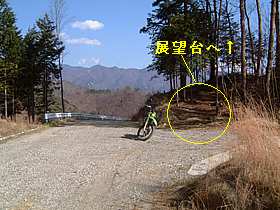 | また上条峠からは遊歩道が延びており(写真左)、徒歩で約2分ほど登っていくと四阿(写真中央)の建つ展望所へと行くことができます。ただここからの景色は余り良くありません。南西方向が開けているのですが、小倉山や周囲の木々に遮られるため塩山市街や「塩ノ山」を僅かに望む程度です(写真右)。 | ||||||||||||||