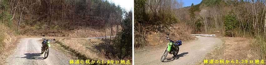 | ダート路の道幅も約1.5車線あり4輪同士の擦れ違いも可能です。ただ路面には厚く砂利が敷かれているため、ややタイヤが埋まる感覚があります。また勾配も大きいので2輪駆動の4輪などではタイヤを空転させながら上ることになるかもしれません。写真右は林道の杭から約500mの地点ですが、九十九折れの坂が重なるようにして延びています。 | ||||||||||||||