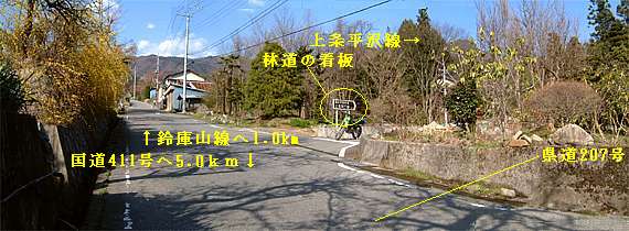 | なおこのダート路は林道の杭から約30mほど進むと舗装路へと変わります(写真左)。同地点はY字路になっていますが右の道は直ぐに民家の敷地へと突き当たってしまうので左へと進んでいきましょう。林道の杭から約300mで県道207号(写真右)へと抜けられます。県道207号へと出る場所は塩山市平沢地区で、突き当たった場所を右へと進むと約1.0キロで林道鈴庫山線となり、逆に左へと進むと約30mで県道207号の玉宮バス停、更に約5.0キロで国道411号の「新千野橋(千野地区)」へと至ります。つまり逆側から行く場合は国道411号から県道207号へと入り約5.0キロほど走った地点が入り口となっています。こちらにも「市営林道 上条平沢線」という看板が出ているので直ぐに分かるはずです。 | ||||||||||||||