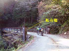 | 分岐路を進んでいくと約200mほどで「水呑橋(写真左)」、その50mほど先で「船山橋(写真中央)」と渡っていきます。一帯は渓谷になっており、船山橋の下には船山川が小さな渓谷美を作っています。船山橋を渡ると若干勾配も大きくなり林道の趣が色濃くなっていきます。 | ||||||||||||||